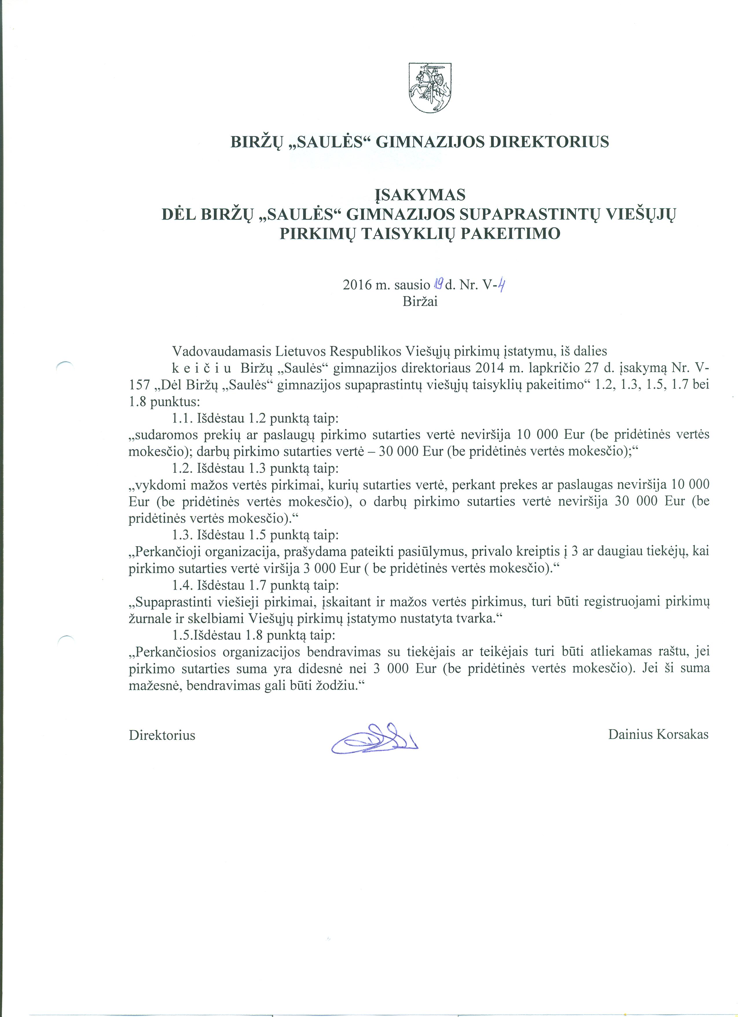 Įsakymas "Dėl Biržų "Saulės" gimnazijos supaprastintų viešųjų pirkimų taisyklių pakeitimo" 2016 01 20 2023-10-23 17:27:07 581.6 KB