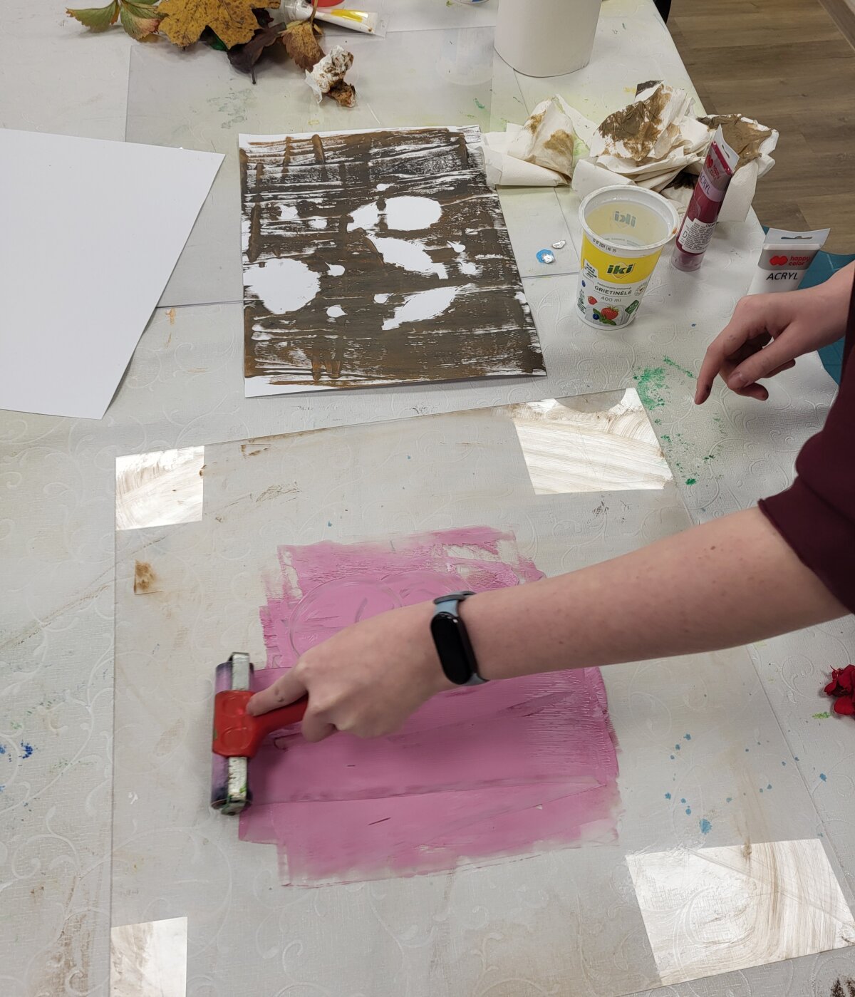 Kurioje dalyvavo Biržų rajono Vabalninko Balio Sruogos gimnazijos 7kl. mokiniai. Pamokos metu mokiniai susipažino su monotipijos technika, o praktinį darbą- žaidimą su spalvomis, spalvų maišymą, kuris greitai įtraukė mokinius į smagią, kūrybišką veiklą, atliko naudodamiesi TŪM projekto metu įsigytomis priemonėmis. Buvo spalvinama ir spaudžiama keletas monotipijos sluoksnių, spaudimui naudojami įvairūs augalų lapai. Monotipijos technika atspausdinti A3 formato lapai bus sukarpomi į juosteles ir įlaminuojami bei dekoruojami per kitą dailės pamoką Vabalninko Balio Sruogos gimnazijoje. Knygų skirtukas - renginių, skirtų Balio Sruogos vardadieniui ir jubiliejui, paminėti dalis. Tikimės, kad mokinių sukurtas knygų skirtukas taps spalvingu suvenyru, simbolizuojančiu rašytojo Balio Sruogos kūrybą.
