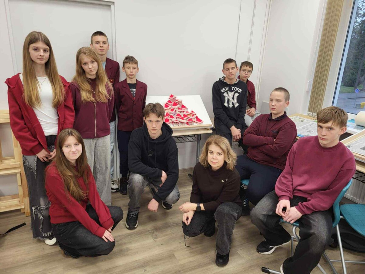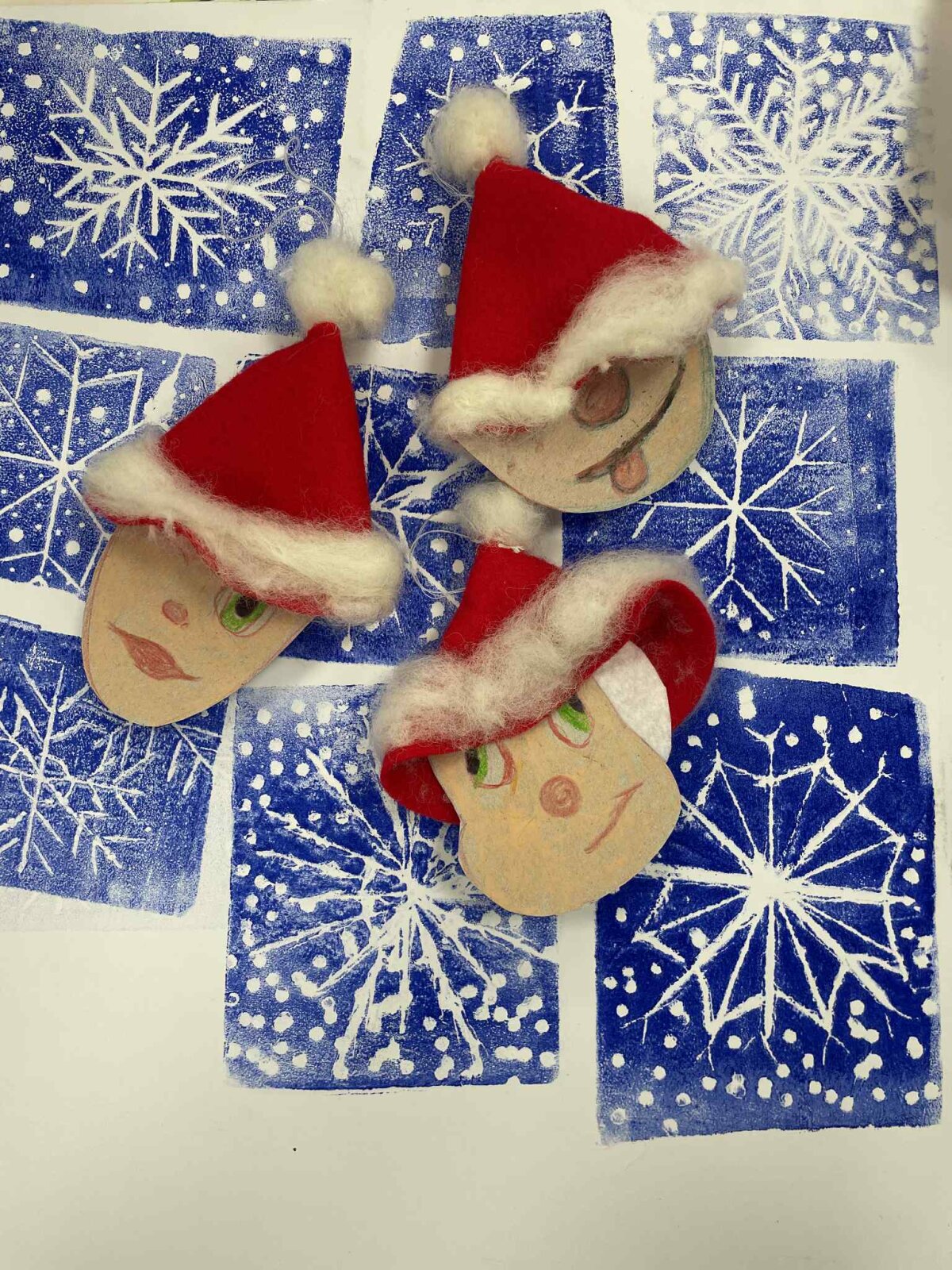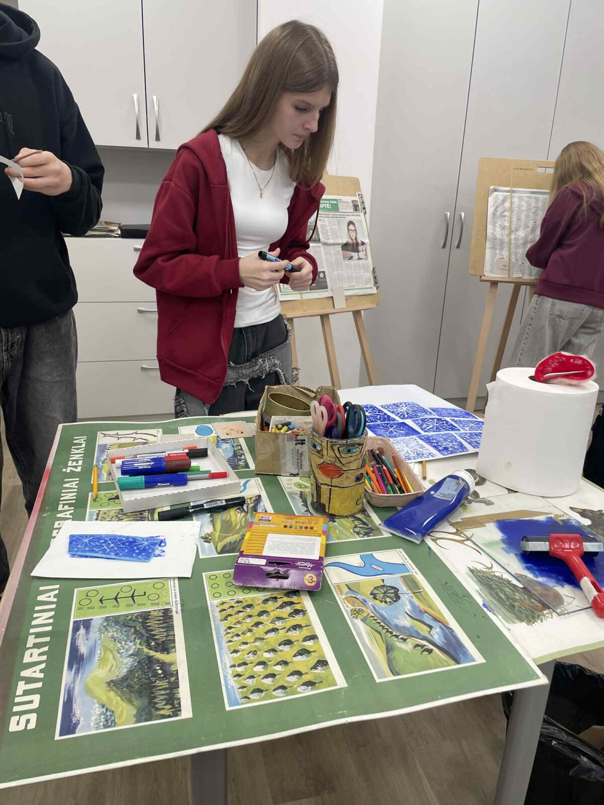 Vos tik mokiniai išklausė pamokos pristatymą, peržiūrėjo smagią vaizdo medžiagą ir išgirdo, kokia užduotis jų laukia, – visi entuziastingai kibo į darbą! Pirmiausia ant polistirolo jie kūrė snaiges: piešė, spaudė, eksperimentavo – ir štai, snieguotas fonas mūsų būsimiems dailės ir technologijų darbams jau paruoštas! Toliau – nykštukai. Jų veidukus nupiešti nebuvo sunku, todėl kūryba įsibėgėjo taip greitai, kad kiekvienas mokinys spėjo nupiešti net po tris linksmuosius nykštukus! Pamokos pabaigoje visi drauge aptarėme rezultatus – sniego fone išdykę nykštukai atrodė tarsi ką tik iššokę iš kalėdinės pasakos. O tada jie linksmai „iškeliavo“ atgal į Vabalninko B. Sruogos gimnaziją – papuošti mokinių kūrybinių erdvių.