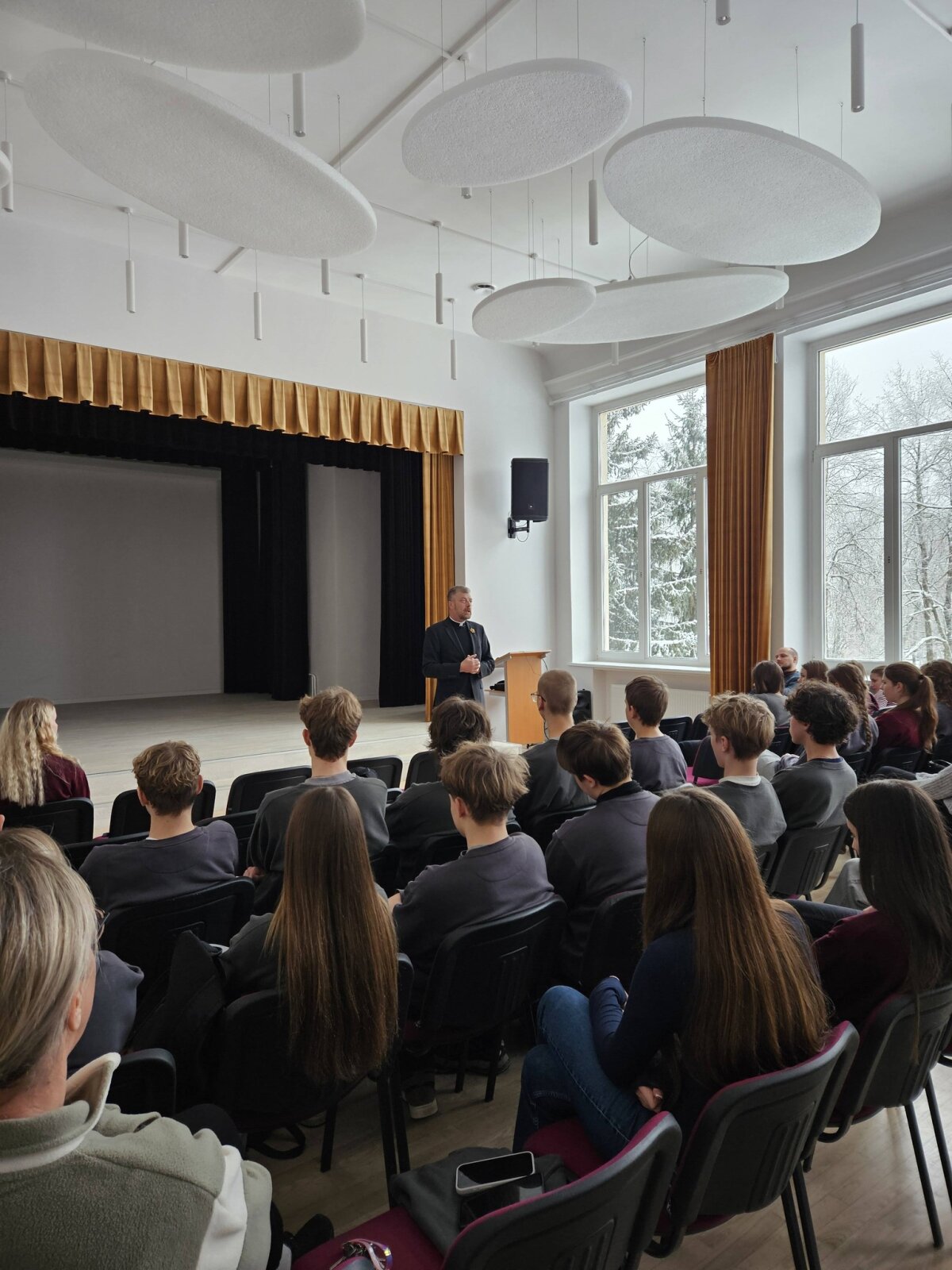 Svečias mokiniams pasakojo apie šiandienines vertybes ir pasirinkimus, savo tikėjimo kelią, kuriame nuolat susidurdavo su laisvos Lietuvos ženklais. Jis dalijosi prisiminimais apie rastas Lietuvos Katalikų Bažnyčios Kronikas ir jų reikšmę anuomet bei šiandien, pabrėžė, kad laisvė rinktis ir būti laisvam nėra absoliuti vertybė – svarbiausia, kad asmeninė laisvė nevaržytų kito žmogaus laisvės.